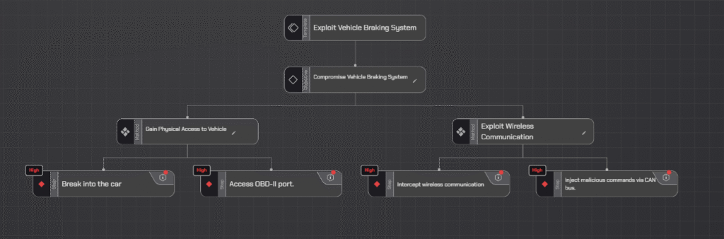 This structure allows the identification of potential security gaps in both physical and wireless aspects of the vehicle’s braking system.