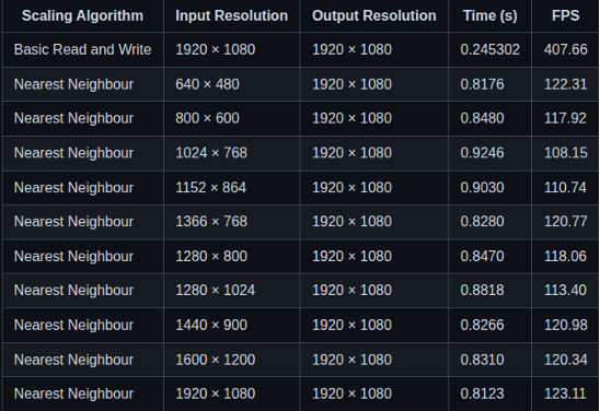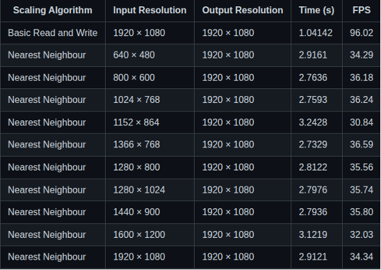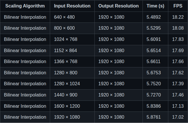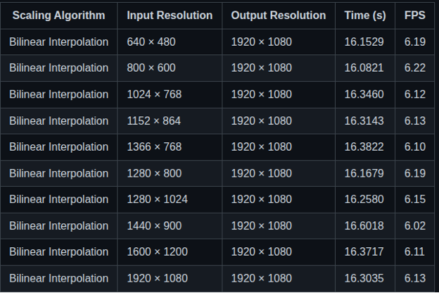 This baseline setup revealed key characteristics of the system’s memory performance. Since no processing was done on the image data, the test isolated the cost of memory I/O alone. It helped understand how well the CPU handles frame-sized memory blocks under repeated access and gave an initial idea of what portion of frame processing time might be consumed purely by memory movement, independent of any image manipulation like scaling or filtering. This experiment served as the groundwork before progressing to more complex operations like CPU-based scaling.