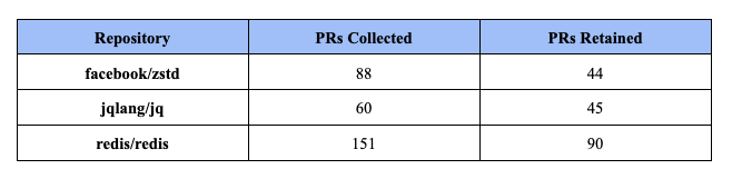 The table below summarizes the number of PRs before and after filtering:
