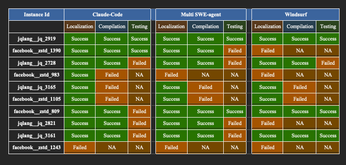 Each framework was tested on a curated subset of issues from the SWE-bench-C dataset. The goal was to assess their adaptability to C-based codebases and their effectiveness in resolving issues under real-world repository constraints. The evaluation results are summarized in the table below.