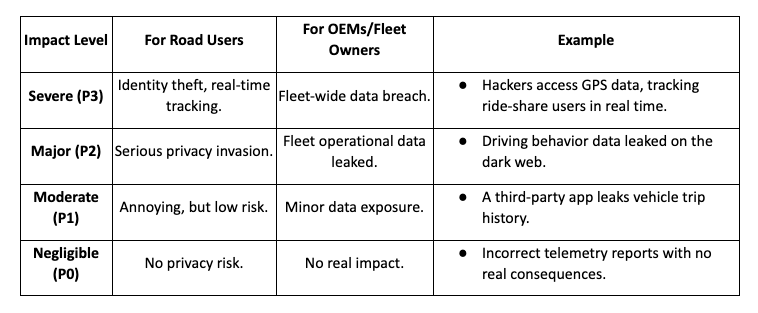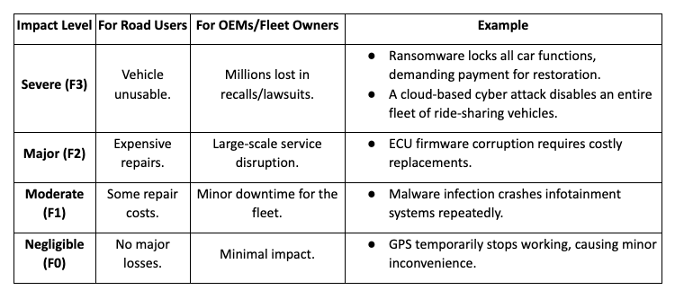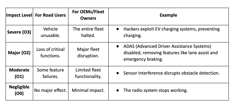 Impact ratings assess the severity of a cyberattack on a vehicle or fleet. The impact is categorized into four primary areas: