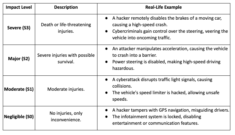 Cyberattacks on vehicles can lead to catastrophic consequences, including loss of human lives, financial damages, operational disruptions, and data breaches. To mitigate these risks, ISO 21434, an international standard for automotive cybersecurity, provides a structured framework to evaluate and manage cybersecurity risks.